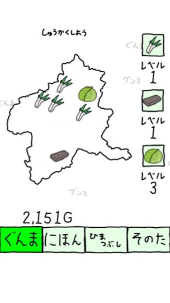 ぐんまのやぼうのゲーム構成は非常にシンプルです。起動すると群馬県が表示され群馬県上に資源(ねぎ、こんにゃく、キャベツ)が生えてきます。その資源を収穫するとG(GUNMA)が手に入ります。Gを使うことで周辺の各都道府県を制圧して群馬県にできます。最終的には「日本を全て群馬県にする」というのが目標のゲームです。資源は一定時間すると勝手に生えてくるほか、資源のレベルを上げると収穫時のGが増えます。まずは少ないGで制圧可能でライバル意識の強い栃木県を群馬化するといいでしょう。